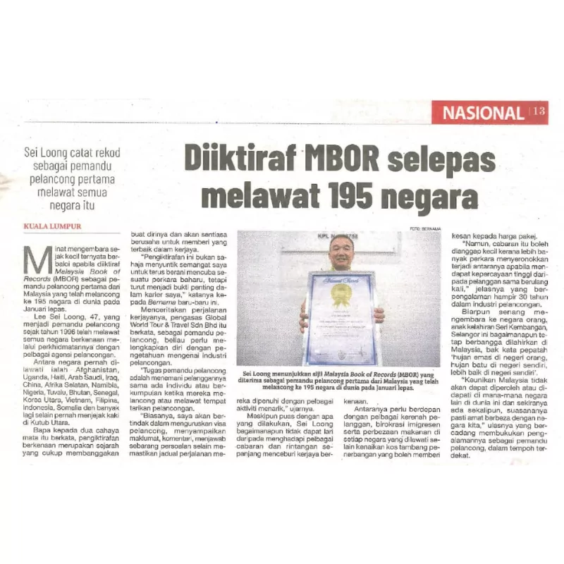 In 2023, Salem Lee Sei Loong achieved a remarkable feat by leading the first Malaysian leading tour to visit every country in the world (UN members), as officially confirmed by the Malaysian Book of Records. This accomplishment, coupled with the encouragement of his guests, inspired Salem to establish a unique tour company.